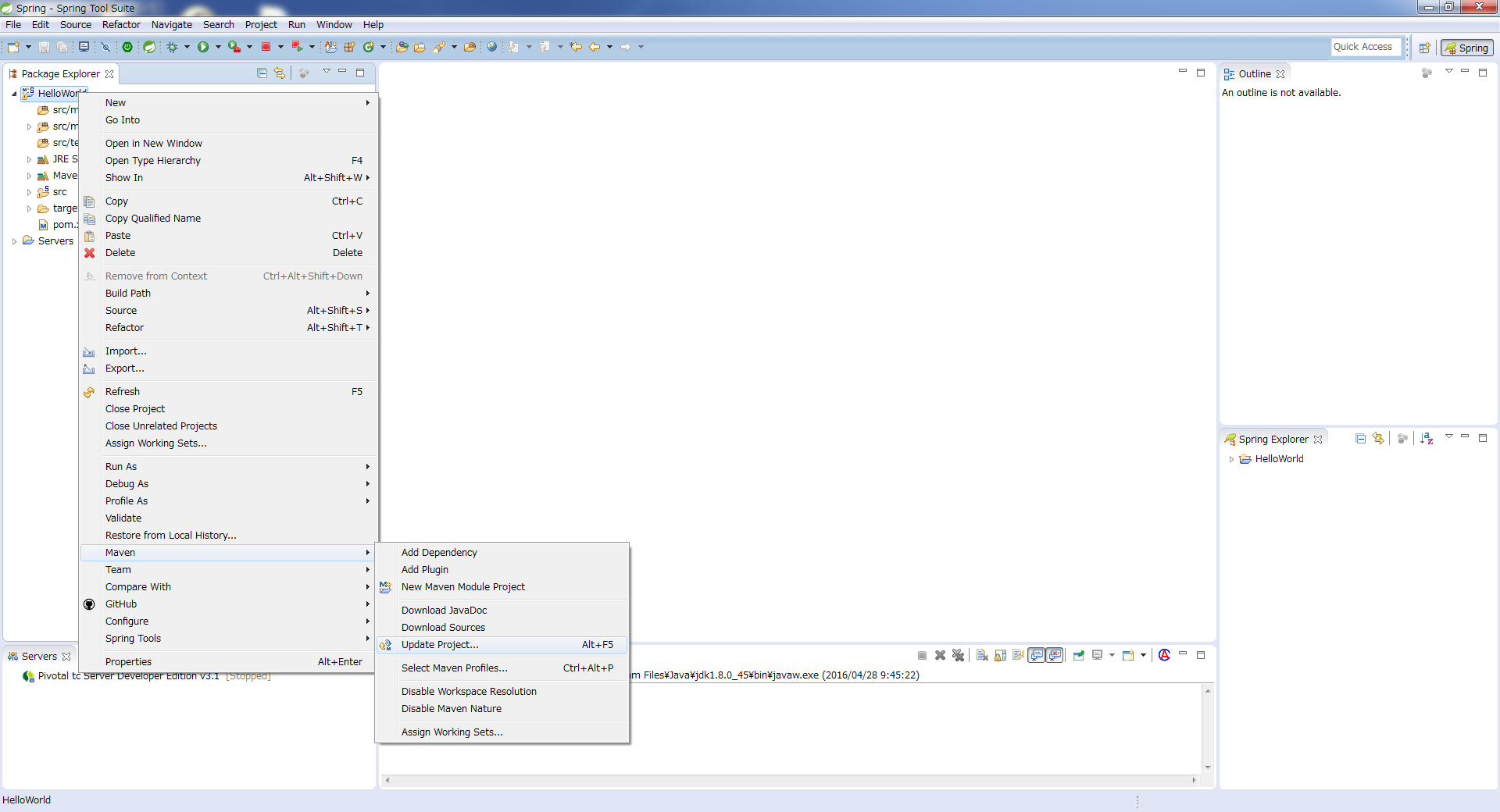 「HelloWorld」を右クリック⇒「Maven」⇒「Update Project…」を選択します。