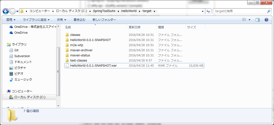 正常にMavenが動作している場合、下記のようにtargetフォルダの中にwarファイルが作成されてます。