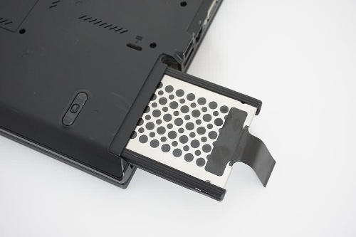 今回のThinkPad T420では、内部ベイの近くにあるネジを1本外してカバーを取り外し、内部ベイのトレーに付いてくるフィルムを引っ張るだけで、内部ベイごとHDDを取り出せる。HDDはこの内部ベイのトレイに4本のネジで固定されているので、このネジを外してHDDを取り出し、そのスペースにSSDを組み込もう。