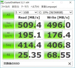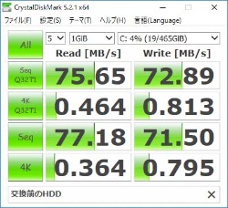 交換前と、交換後のストレージ性能をCrystalDiskMarkで計測したものが下の画像である。HDDは古い500GBモデルなので、連続読み出しや書き込みは70MB/秒前後とかなり遅い。しかしSerial ATAポートはSerial ATA 6Gbpsに対応しているため、今回のような最新の高性能SSDを組み込めば、読み書き性能は大幅に向上する。