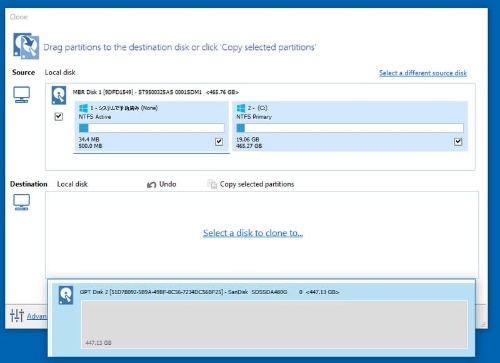 画面上の「Source」(クローン元)として表示されているのは、現在利用しているHDDだ。「Destination」(クローン先)の枠はこの段階では表示されていないが、枠の中にある「Select a disk to Clone to ……」をクリックすると、USBポート経由で接続しているSSDが下に表示される。これをクリックするとDestinationの枠内に、SSDが登録される。