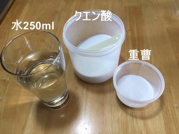 - コップに浄水250ccとクエン酸2.5gを入れる