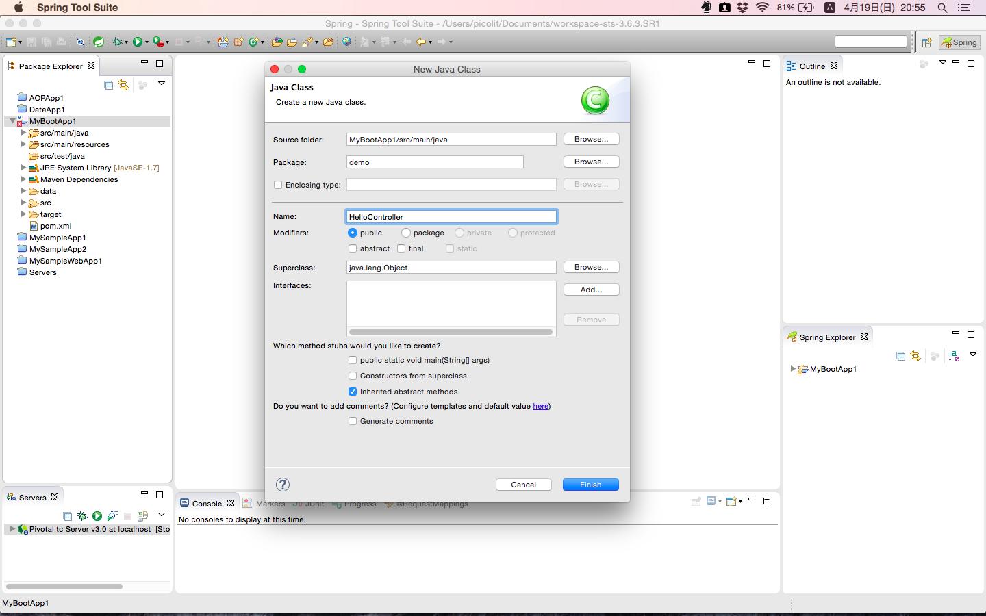 HelloController.javaを下記のように修正します。