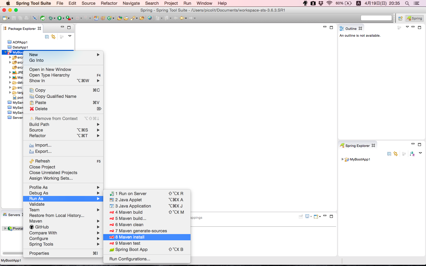 次に、作成されたプロジェクトを右クリックして、「Run As」から「Maven install」を選びます。