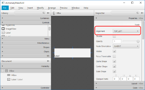 これはVBoxのデフォルトのAlignmentプロパティがTOP_LEFTになっているためです(図9の赤四角部分)。Alignmentプロパティは前回も紹介しましたが、コンテナにおける子要素の配置を決めるためのプロパティです。