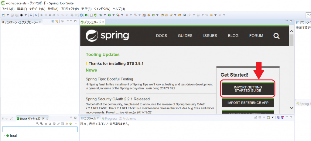 STSが起動すると「ダッシュボード」が表示されると思いますので、その中の「IMPORT GETTING STARTED GUID」をクリックします。