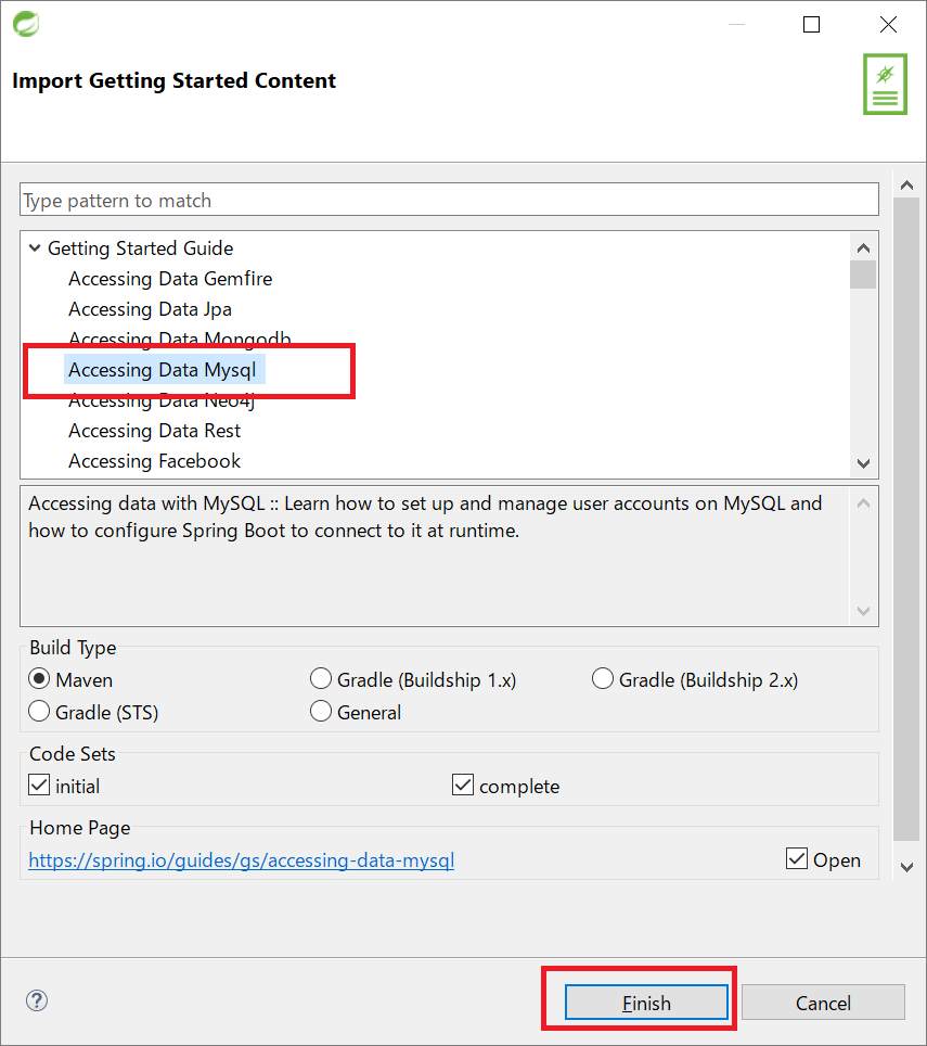 下のダイアログが表示されますので、「Accessing Data Mysql」を選択し、「Finish」ボタンをクリックします。