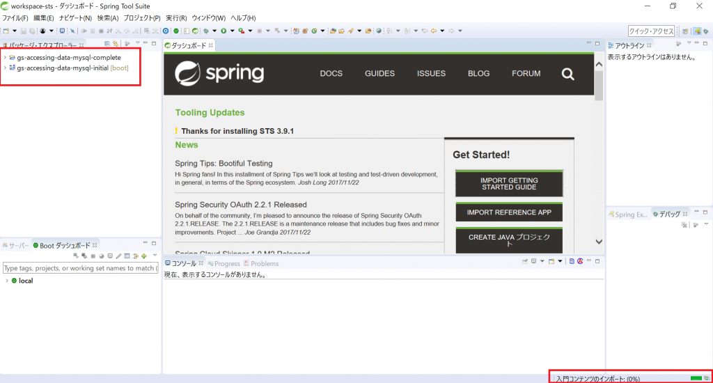 3分ぐらいでインポートが終わります。STSの右下にプログレスバーが表示されますので完了まで少し待ちましょう。