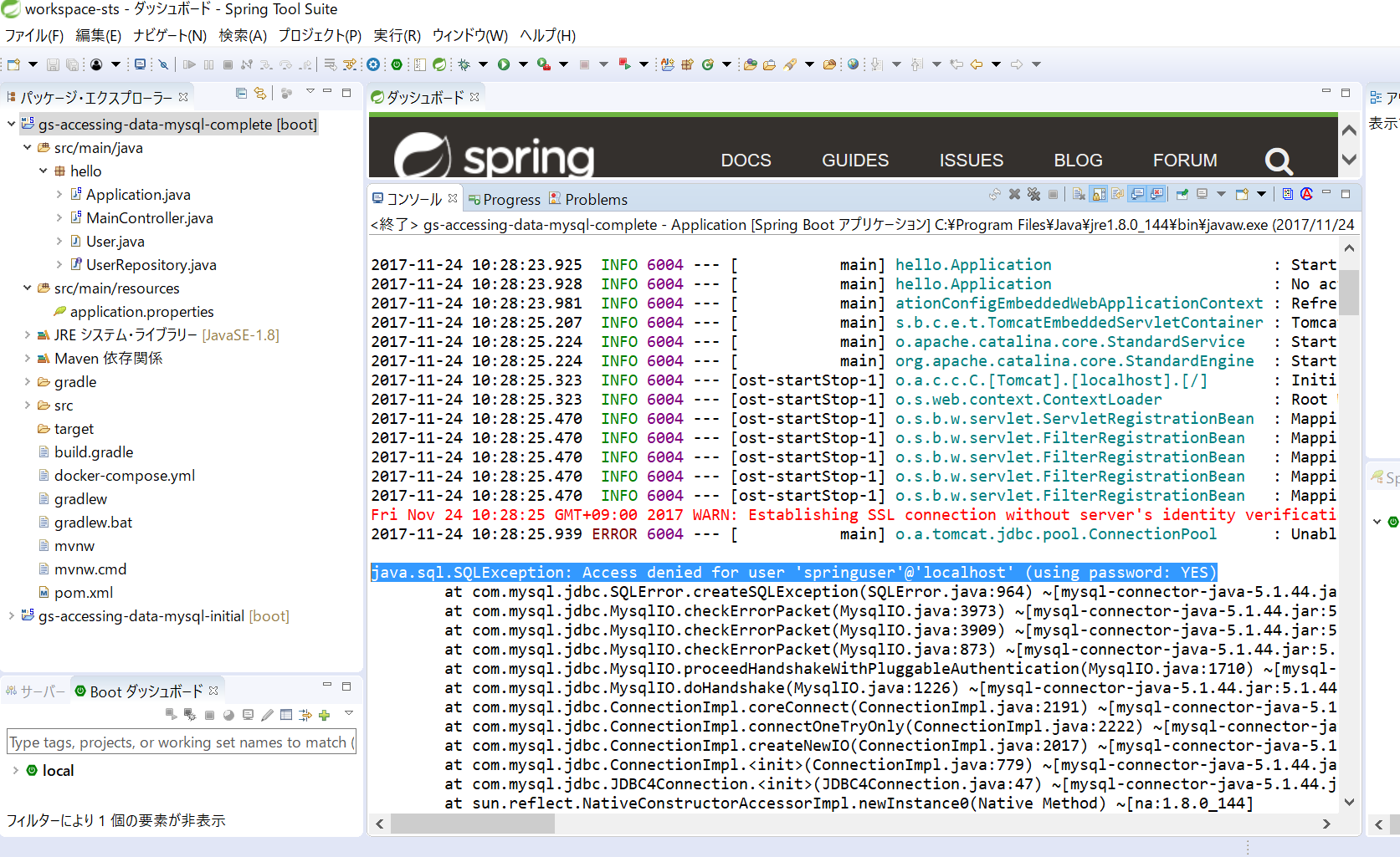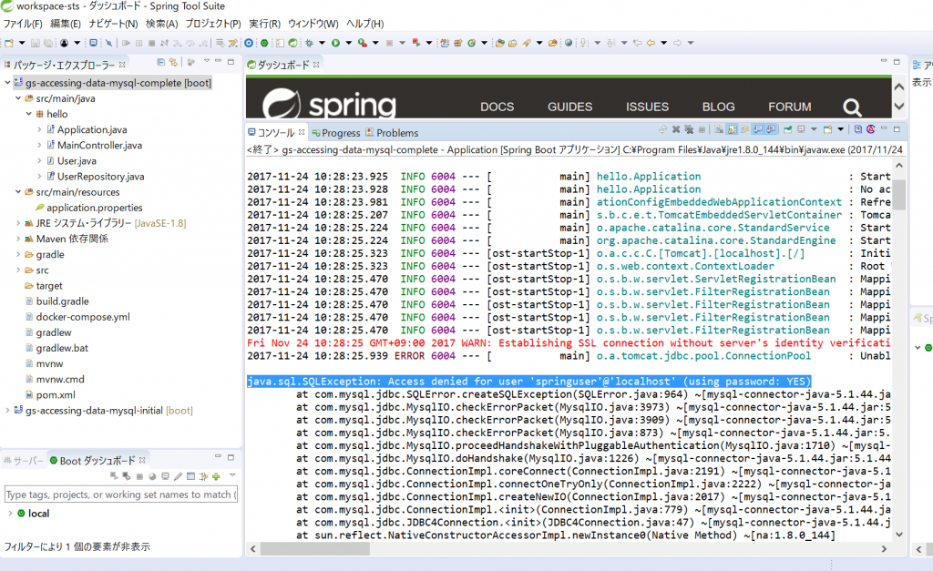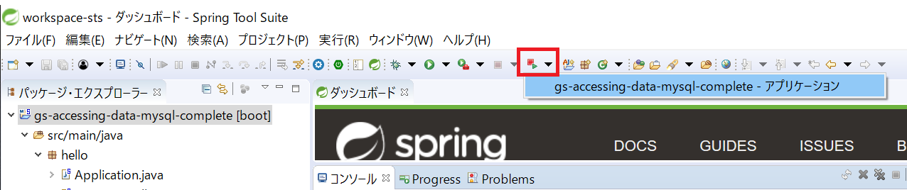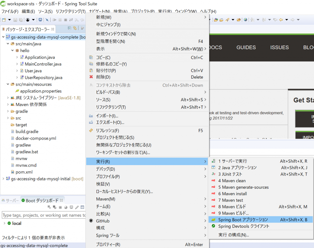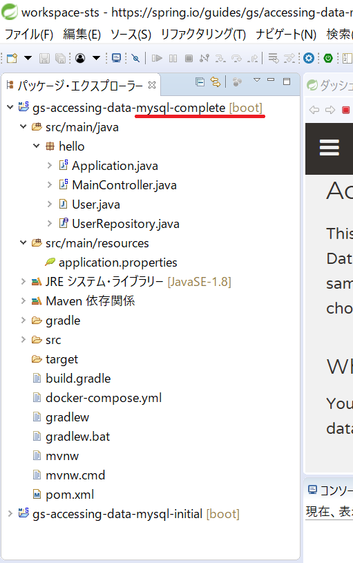 インポートが完了したら、サンプルプログラムを動かしましょう。2つインポートされたプロジェクトのうち、「gs-accessing-data-mysql-complete」を動かします。※「gs-accessing-data-mysql-initial」は中身が空っぽで枠組みだけとなりますので注意してください。