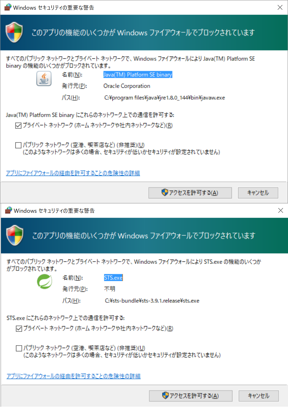 実行する際、「Windows ファイアウォール」の警告が表示されますので、「アクセスを許可する」でアクセス可能にしてあげましょう。