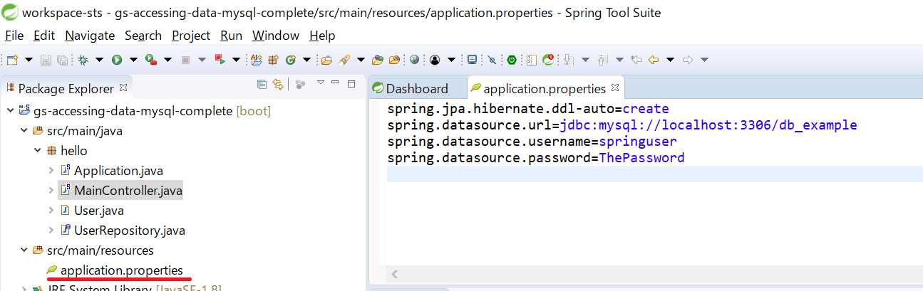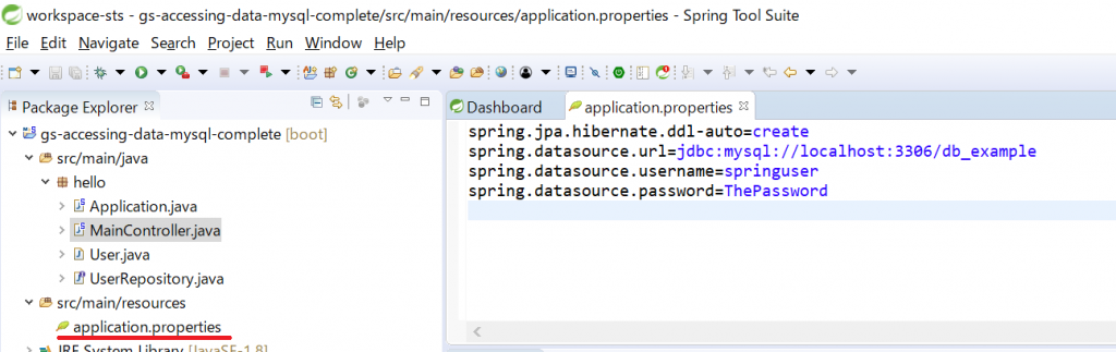 「gs-accessing-data-mysql-complete」の階層を開いていくと、以下のようなJavaプログラムと「application.properties」がありますので、ファイルが存在することを確認しておきましょう。「application.properties」は、重要な設定ファイルですので意識しておきましょう。