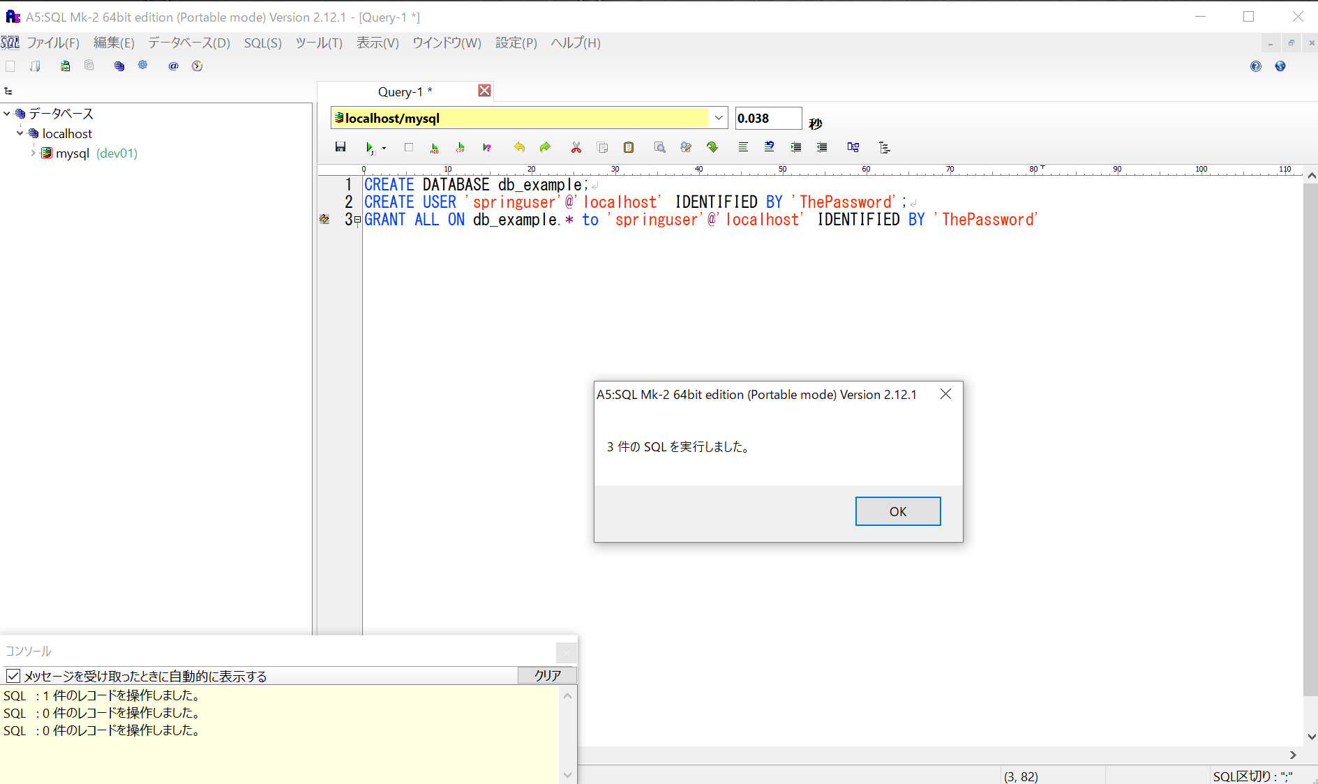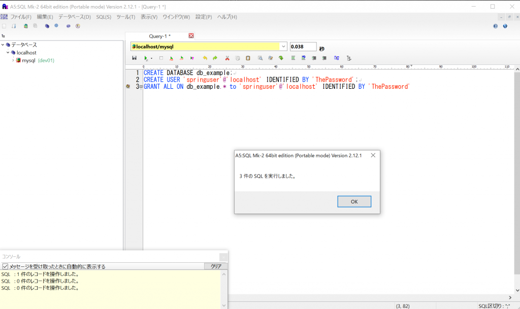 今回の場合は、以下のSQLを実行することで一通りの環境が整います。
