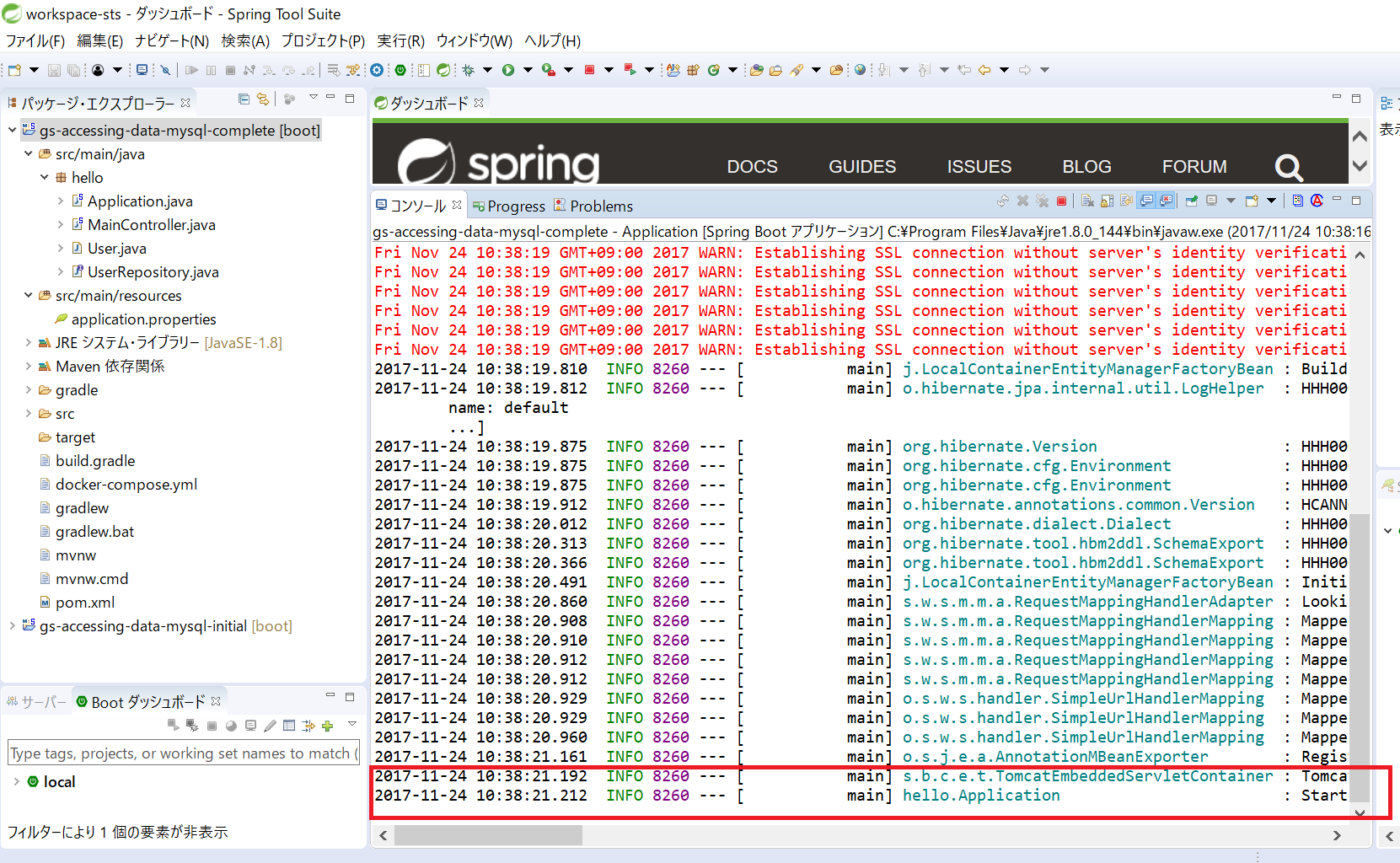 MySQL側の設定に問題がなければ、「Tomcatが立ち上がってアプリケーションが開始したよ」とログ出力されます。以下の2行が表示されているか確認しましょう。