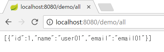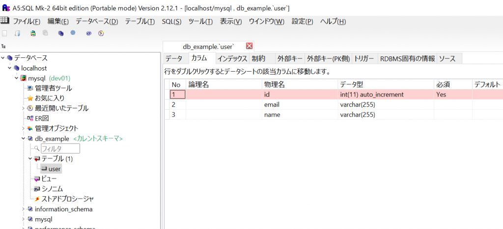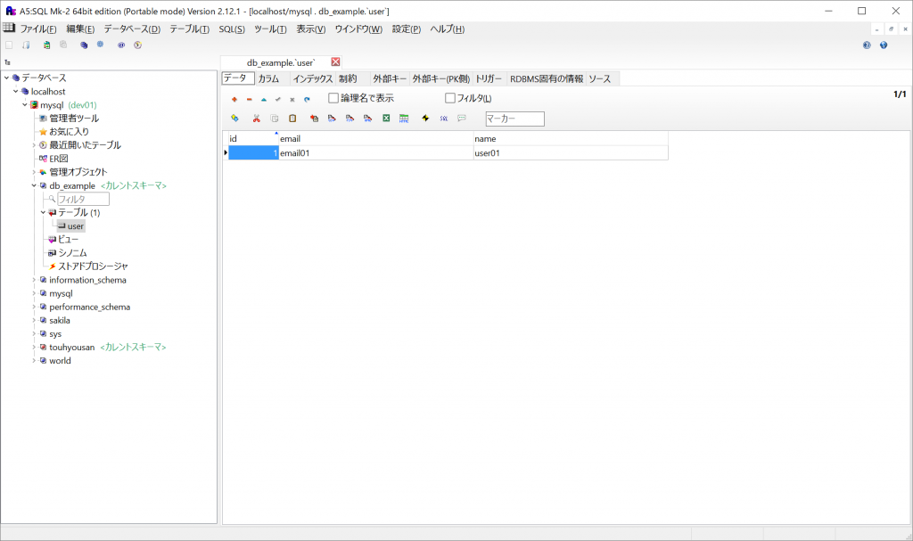 「user」というテーブルが作成され、先ほどURLのパラメータとして渡した、「user01」と「email01」がしっかり登録されています。