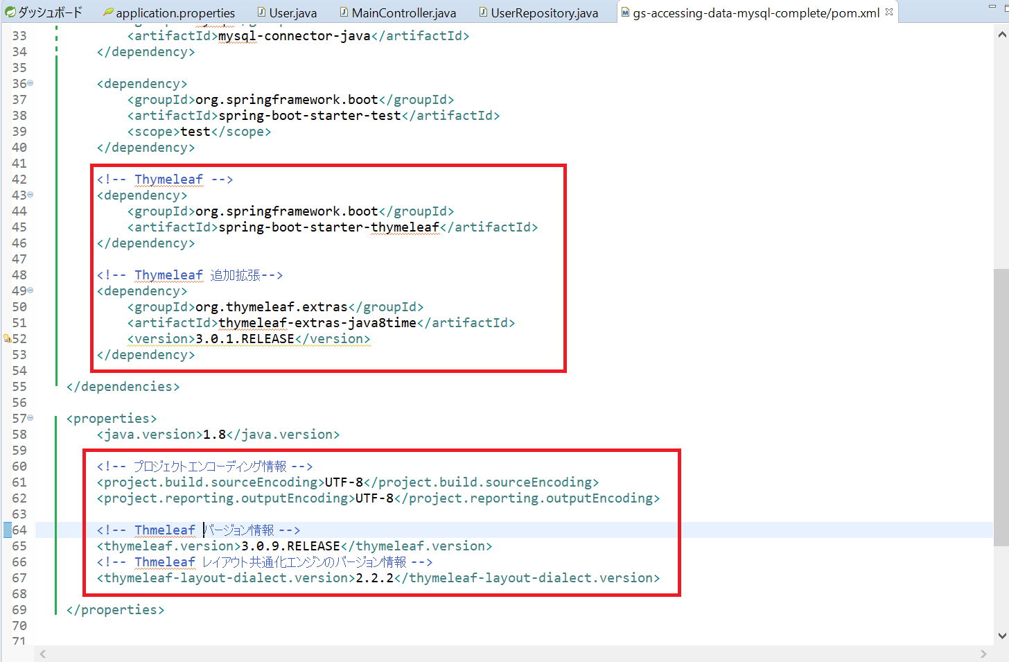 まずは、pom.xmlを修正して、Thymeleafのライブラリをインポートしましょう。