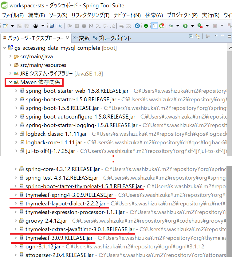Mavenがリモートリポジトリからライブラリのダウンロードを完了すると、STSの「Maven依存関係」のリストに先ほどpom.xmlに追加したThymeleaf関連のライブラリが表示されますので、サクッと確認してください。