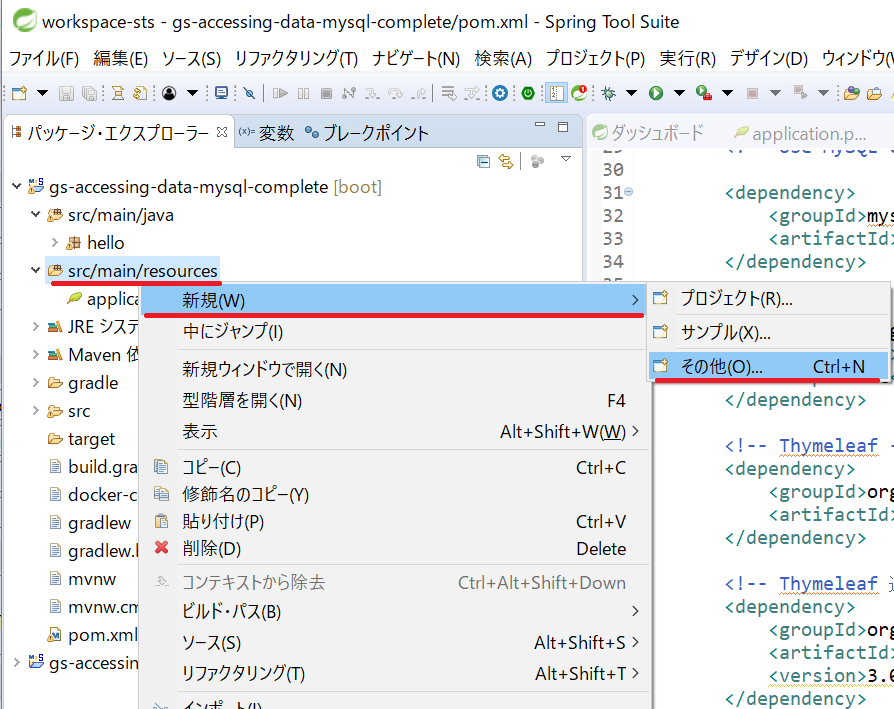 Thymeleafはデフォルトで「resources」配下の「templates」というパスを参照するようになっていますので、そのパスを作ってあげます。パッケージ・エクスプローラーから「src/main/resources」を右クリックし、[新規]→[その他]を選択します。
