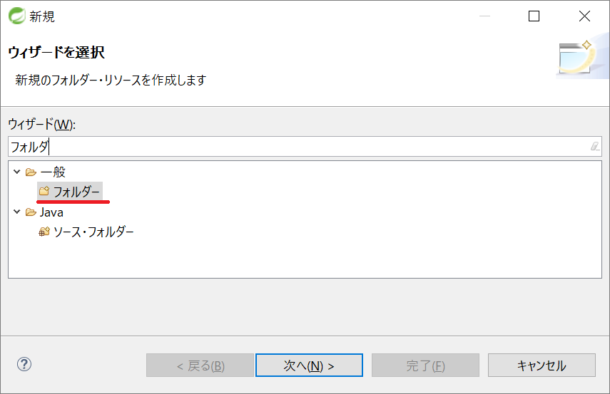 ウィザードが表示されたら、下の画像の様に「フォルダ」と検索すると「一般>フォルダー」が表示されますので選択して「次へ」ボタンをクリックします。