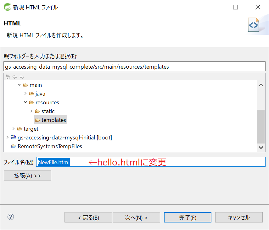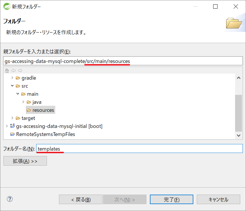 下の画面が表示されたら、フォルダの作成パスが合っていることを確認し、フォルダ名に「templates」と入力して「完了」ボタンをクリックしてください。