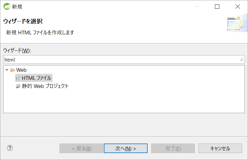 先ほど同じようにパッケージエクスプローラーから「templates」フォルダを右クリックし[新規]→[その他]を選択します。ウィザードが表示されたら「html」と入力して、表示された「HTMLファイル」を選択し、「次へ」ボタンをクリックします。