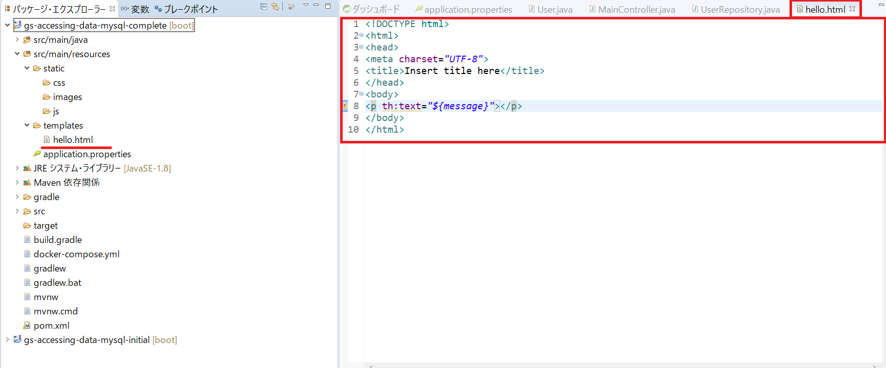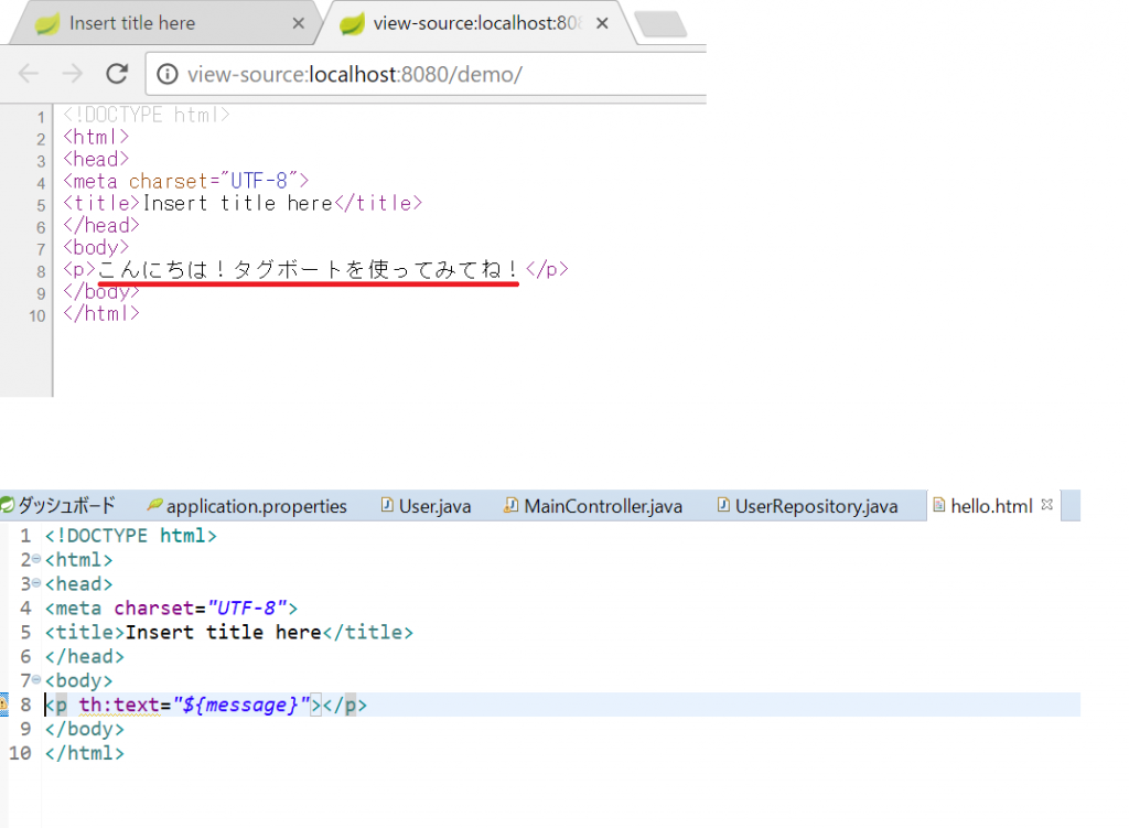 です。ポイントは「th:text=”${message}”」です。<p>は、ご存知、HTMLの<p>タグです。