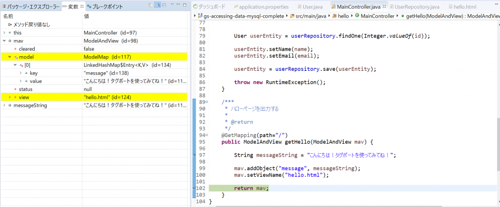 ブラウザで上記のURLへアクセスすると、事前に仕掛けておいたブレイクポイントで止まりました。mavインスタンスのmodelにKeyとValueで値が格納されたことが分かります。またviewにもしっかり”hello.html”が格納されていますね。F8キーを押して処理を続行しましょう。