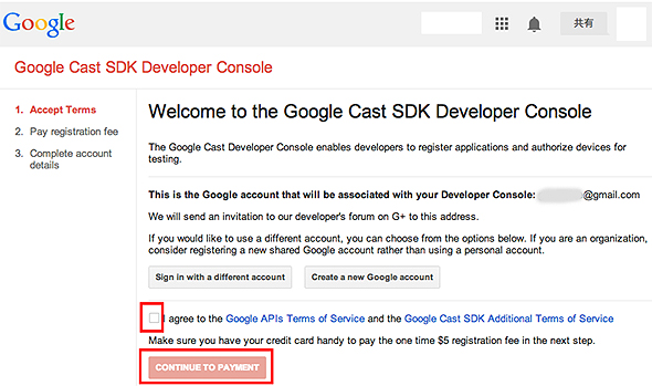 「Google Cast SDK Developer Console」に初めて訪れると、ログインしているGoogleアカウントで開発者登録する画面が表示されます。問題がなければ、支払手続きに進みます、Google Walletで決済を行うので、あらかじめ登録を済ませておくといいでしょう。