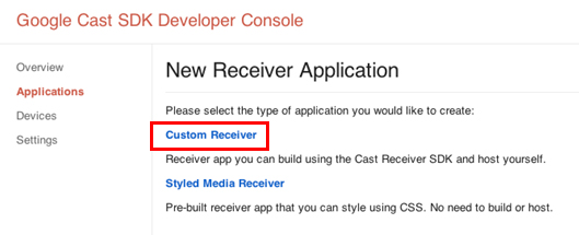 Receiverアプリには、「Styled Media Receiver」「Custom Receiver」の2種類が選択できます。前者は、あらかじめ用意されているメディア再生用のプレーヤー(JavaScriptアプリ)を使用し、CSSでスキンを変更するだけのアプリです。これはAdaptive Bitrate StreamingやDRMなどは対応しておらず、柔軟なUIを作成できません。大抵の場合、Custom Receiverを選択することになります。