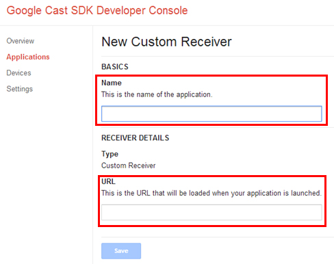 最後に、「Custom Receiver」の情報を入力します。「Name」にReceiverアプリの名前、「URL」にデプロイ先のURLパスを指定します。