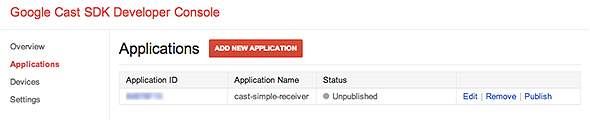 「Devices」で、開発に使用するChromecastデバイスを登録します。ここで登録していないデバイスでは「Unpublished」のアプリへの接続とリモートデバッグができません。