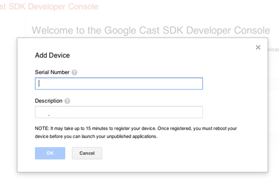「Serial Number」には、Chromecastデバイスに印字してある12桁のコードを入力します。登録が完了するまで、およそ15分かかります。登録完了後は、必ずChromecastデバイスを再起動する必要があります。