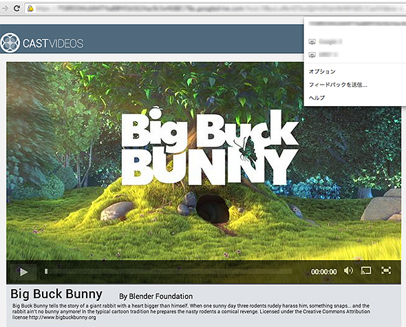 続いて、Castアイコンからネットワーク上にあるChromecastデバイスを選択します。Receiverアプリが正しく登録されていない場合は、この一覧にChromecastデバイスが表示されません。Developer Consoleに登録直後は表示されないこともあります。その場合は、少し時間を空けてから試してください。