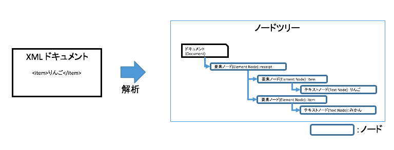 DOMはXMLドキュメントを読み込んで解析し、ドキュメントと呼ばれるノードツリーを作る。要素がノードで表され、ノードの関係がノードツリーで表されている。ノードツリーが作られると、その中の要素をDOMのAPIでノードとして扱うことができる。