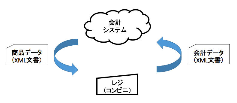 例えば、あらかじめXMLで表現された商品データを会計システムからレジにダウンロードしておく。逆に、レジで清算が終わった時、今度はXMLによって表現された会計情報をレジから会計システムに送るといったことが行われている。