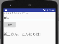 これは、画面に配置した入力ボックスに名前を入力し、ボタンをタップしたら「■○さん、こんにちは!」と表示されるアプリです。