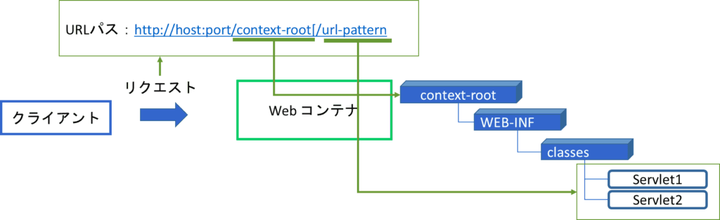 下の図が示すように、クライアントのリクエストは、URLパスを含んでいる。さらに、このURLパスは、コンテキストルートとURLパターンを持っている。この二つの情報からサーブレットは選択され、クライアントからのリクエストが渡される。