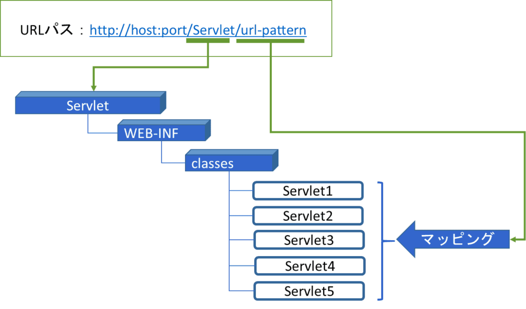 web.xmlによる定義は、サーブレットクラスが一度サーブレット名に紐付けされ、さらにサーブレット名がURLパターンに紐付けされる。このURLパターンがサーブレットのURLパターンとなる。
