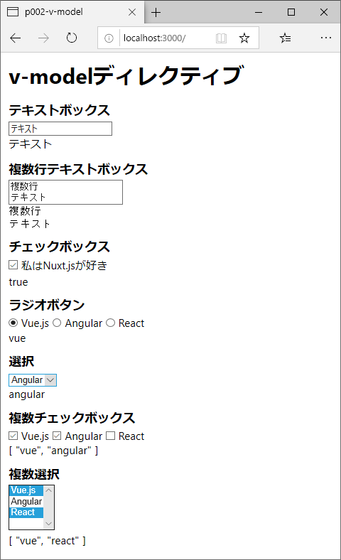 <h3>テキストボックス</h3> <!--(1)--> <input v-model="text1"> <h3>複数行テキストボックス</h3> <!--(2)--> <textarea v-model="text2"></textarea> <h3>チェックボックス</h3> <!--(3)--> <input type="checkbox" id="checkbox" v-model="checkboxValue"> <label for="checkbox">私はNuxt.jsが好き</label> <h3>ラジオボタン</h3> <!--(4)--> <input type="radio" id="radio1" value="vue" v-model="radioValue"> <label for="radio1">Vue.js</label> <input type="radio" id="radio2" value="angular" v-model="radioValue"> <label for="radio2">Angular</label> <input type="radio" id="radio3" value="react" v-model="radioValue"> <label for="radio3">React</label> <h3>選択</h3> <!--(5)--> <select v-model="selectValue"> <option disabled value=""></option> <option value="vue">Vue.js</option> <option value="angular">Angular</option> <option value="react">React</option> </select> <h3>複数チェックボックス</h3> <!--(6)--> <input type="checkbox" id="checkbox1" value="vue" v-model="checkboxArray"> <label for="checkbox1">Vue.js</label> <input type="checkbox" id="checkbox2" value="angular" v-model="checkboxArray"> <label for="checkbox2">Angular</label> <input type="checkbox" id="checkbox3" value="react" v-model="checkboxArray"> <label for="checkbox3">React</label> <h3>複数選択</h3> <!--(7)--> <select v-model="selectArray" multiple> <option value="vue">Vue.js</option> <option value="angular">Angular</option> <option value="react">React</option> </select>