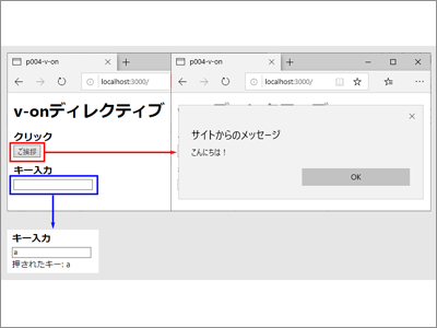 Vue.jsのイベント処理は、v-onディレクティブを利用して「v-on:<イベント名>」形式で記述します。v-onディレクティブの利用方法を、ボタンのクリックとキー入力のイベントハンドラーを実装した図4のサンプルで説明します。