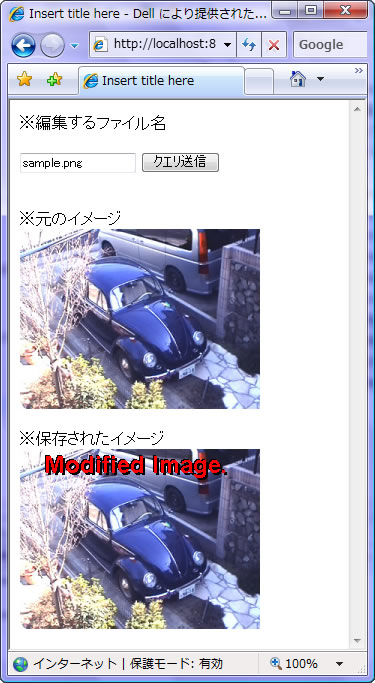 ここでは、フォームからファイル名を「./grahicsImg」に送信するようにしてあります。またその下に、送信したファイル名と、それを元に新たに保存されたイメージ(new_saved.png)をimgタグで表示するようにしてあります。元のイメージと保存されたイメージを並べて表示し、比較するようにしてみました。