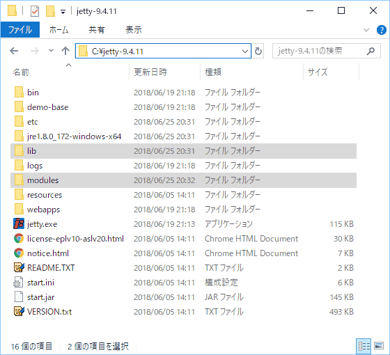 jaxrs-ri-2.27 も展開して、 中に入っている lib と modules を C:¥jetty-9.4.11 に上書きコピーします。