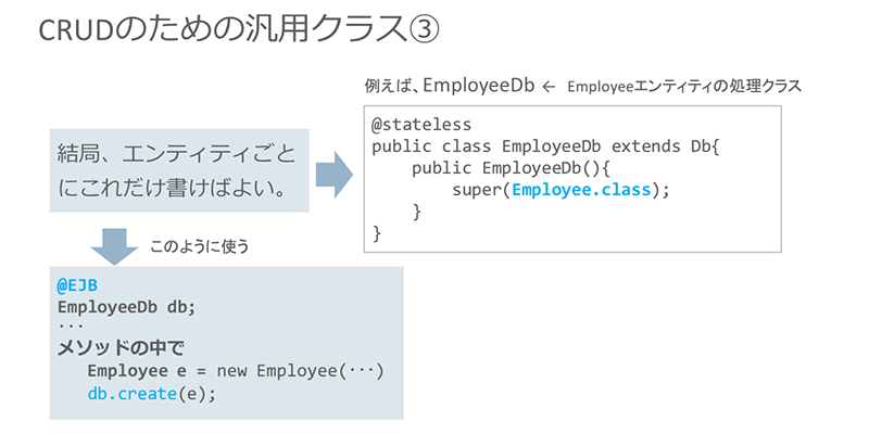 これにより、エンティティごとのEJBクラスのコーディングを次のように簡素化することができます。