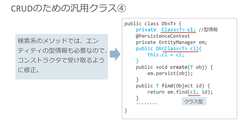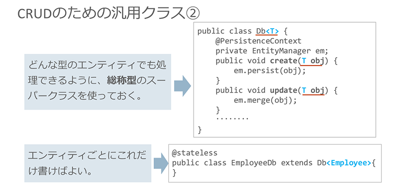 このように、EntityManagerの使い方はとても簡単ですが、エンティティごとにEJBクラスが必要となるため、複数のエンティティを使う場合には作成に手間がかかります。これを避けるには、下図の要領でどのような型のエンティティでも処理することのできる"総称型のスーパークラス"を使うとよいでしょう。