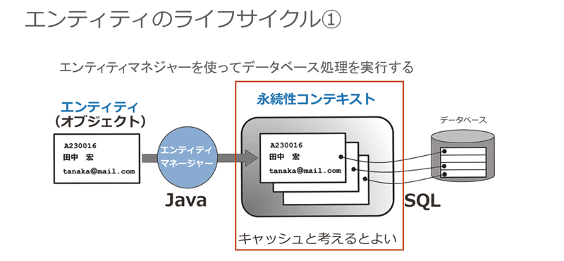 EntityManagerのメソッドで操作したエンティティは、いったんEntityManagerの永続性コンテキストに配置されます。例えば、メソッドcreateでエンティティに対する「新規登録」の操作を行っても、その時点ではデータベースへの書き込みは行われません。実際には、「このエンティティは、データベースに新規登録するデータである」というマークを付けて永続性コンテキストに配置されるだけです。これがオブジェクトの「永続化」であり、EntityManagerによってデータベースへの格納が可能になった状態であることを意味しているのです。