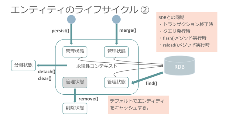 - 永続性コンテキスト:EntityManagerの配下にあり、エンティティの状態を表すオブジェクト
