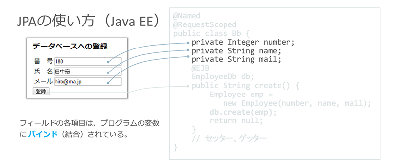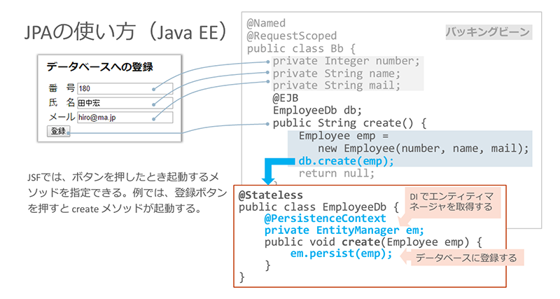 ちなみに、上図に示したBacking Beanのメソッドcreateでは、Webフォームから受け取ったデータを基にしてエンティティ(Employeeエンティティのempオブジェクト)を生成し、「db.create」によってデータベースに登録するという処理を行います。この「db」が、EJBクラスであるEmployeeDbのオブジェクトです。
