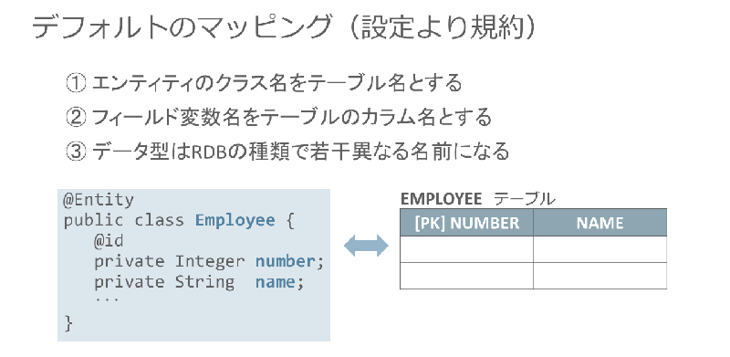 JPAでは、エンティティとデータベース・テーブルをどのように対応づける(マッピングする)かについて、その大枠が標準で決められています。