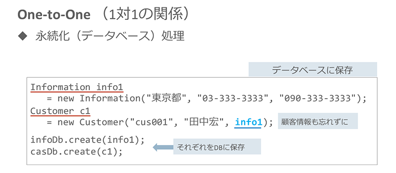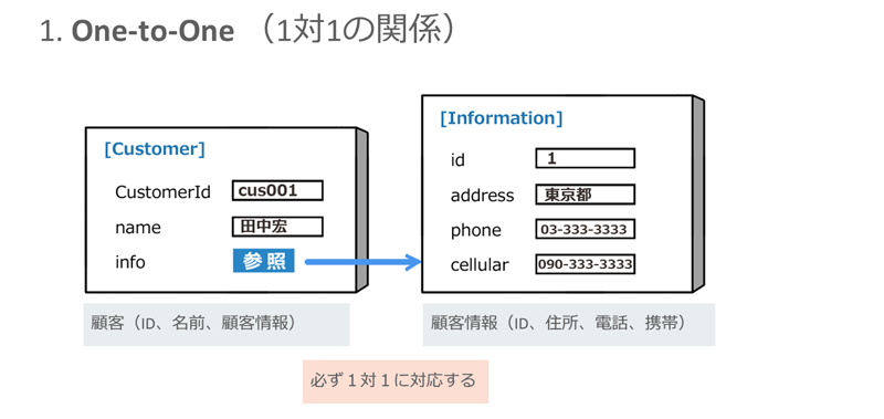 「One-to-One」とは、例えば「Customer(顧客)」オブジェクトと「Information(顧客情報)」オブジェクトを「1対1」の関係で結ぶことを意味します。