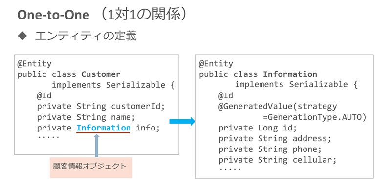 1対1関係のエンティティの定義は、通常のJavaクラスを定義するのと同じです。上図のクラスCustomerとInformationなら、それぞれ下図のように定義します。