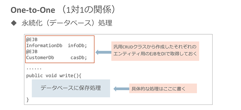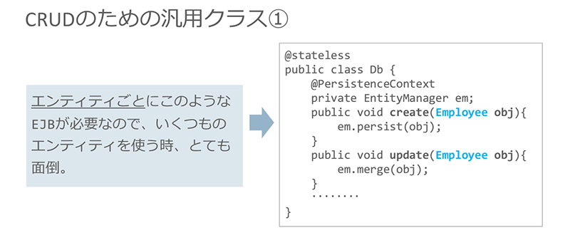 エンティティごとに、上図のように6行のコードから成るクラス、つまりCreate(生成)、Read(読み取り)、Update(更新)、Delete(削除)のCRUD処理を行うEJBクラスを作ればよいわけです。